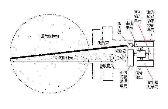 粉塵儀包括激光光源及功率控制單元、光電傳感與小信號預處理單元、散射光接收單元、顯示與輸入單元、輸出驅動單元、主控單元。激光器發出的650nm束以一個微小的角度射入排放源,激光束與煙塵粒子作用產生散射光,背向散射光通過接受系統進入傳感器轉變成電信號進行處理。電路部分實現光電轉換、激光束的調制、信號放大、解調、光源的功率控制、V/I轉換功能。整個系統的構成包括主機及校準系統、吹掃系統、連接附件及防雨箱。