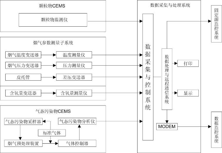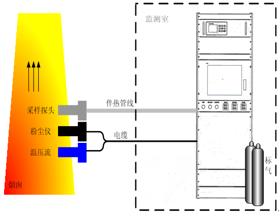 我公司固定污染源煙氣排放連續監測系統由采樣探頭、粉塵儀、溫壓流一體監測儀、分析機柜、標準樣氣、管線等組成。其中采樣探頭、粉塵儀、溫壓流探頭安裝于監測點(煙道或煙囪),分析機柜安放于室內。樣氣通過采樣探頭、伴熱管線進入分析機柜,經由分析機柜內的預處理系統進入煙氣分析儀,測量SO2、NOX、氧含量等參數;粉塵儀用于測量粉塵濃度,溫壓流一體監測儀用于測量溫度、壓力、流速,測量信號通過電纜傳輸至分析機柜內的數據采集與處理系統;置于分析機柜內部的工控系統可實現實時數據的顯示、數據傳輸、數據儲存、歷史數據查詢、圖形數據分析、報表統計等功能。標準氣體用于校準分析儀表。
